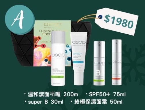 •溫和潔面啫喱 200m • super B 30ml • SPF50+ 75ml • 終極保濕面霜 50ml